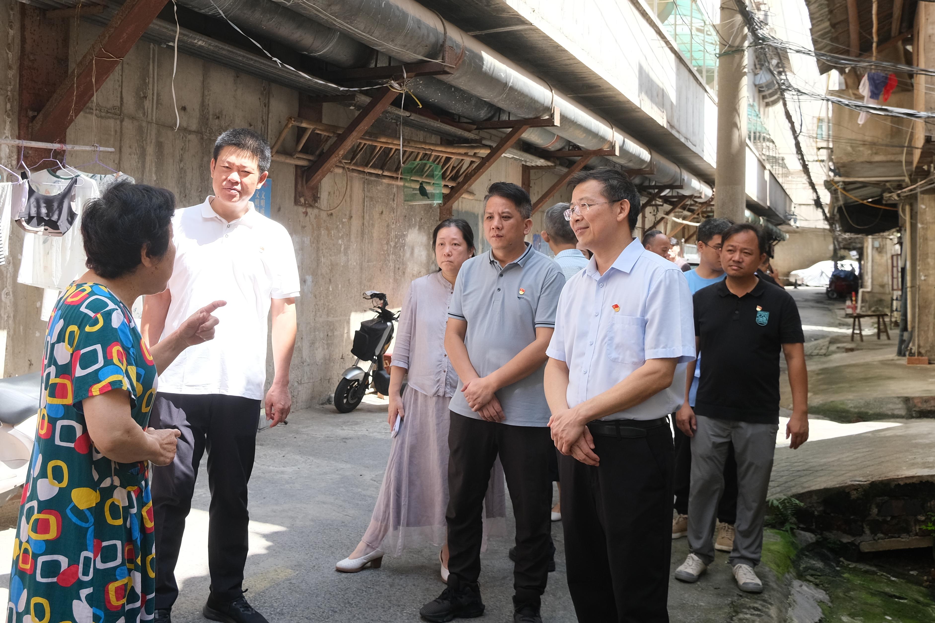 南寧市住建局機(jī)關(guān)第六黨支部書(shū)記、公用事業(yè)三科科長(zhǎng)徐修平(左二)、南寧建寧水務(wù)集團(tuán)黨委委員、副總經(jīng)理周柏建(左五),南寧市排水有限責(zé)任公司第一黨支部書(shū)記、副總經(jīng)理韋雄飛(左四)到中山東二里與社區(qū)居民進(jìn)行交流