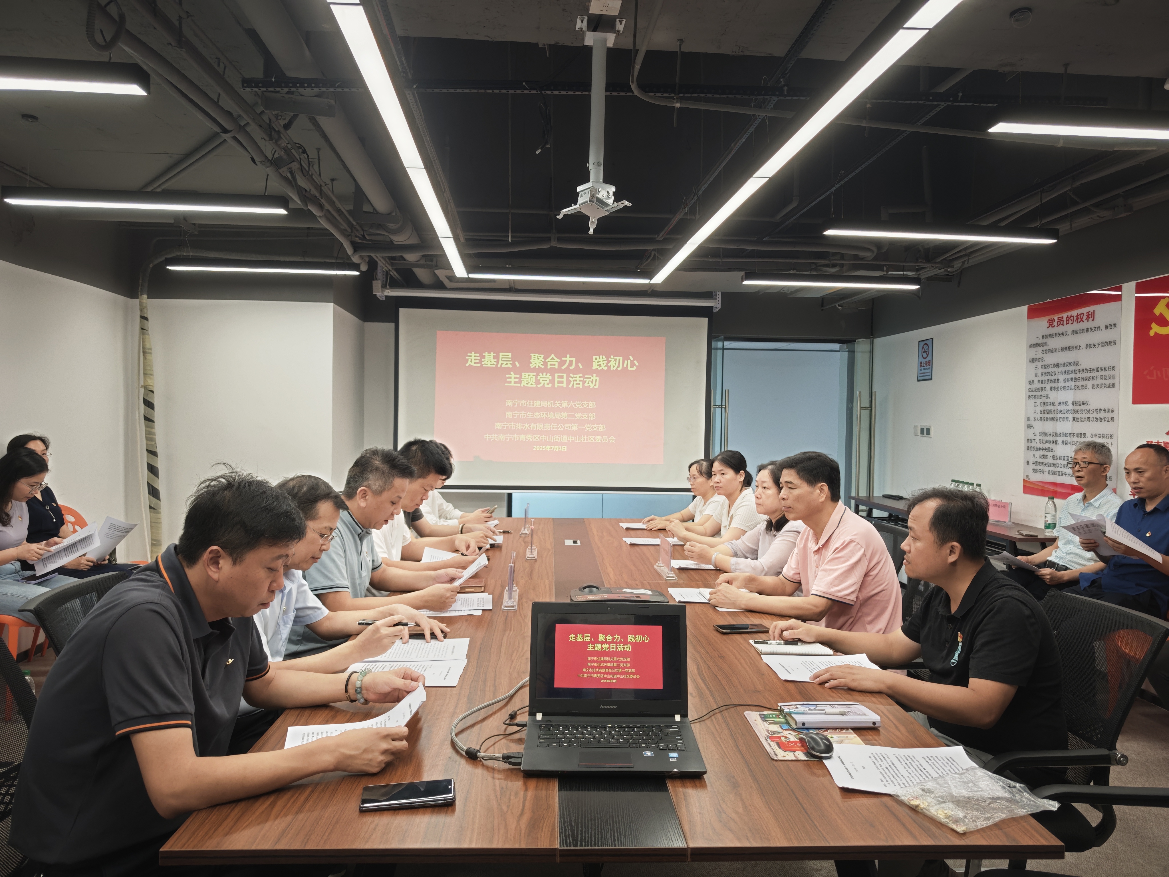 為切實(shí)加強(qiáng)黨建引領(lǐng),進(jìn)一步將黨的組織優(yōu)勢(shì)轉(zhuǎn)化為推動(dòng)基層治理、服務(wù)民生發(fā)展的實(shí)踐動(dòng)能,充分彰顯新時(shí)代共產(chǎn)黨員的初心本色與使命擔(dān)當(dāng),7月1日上午,市排水公司第一黨支部聯(lián)合南寧市住建局機(jī)關(guān)第六黨支部、南寧市生態(tài)環(huán)境局第二黨支部以及中山社區(qū)黨委,共同開(kāi)展了“走基層、聚合力、踐初心”主題黨日活動(dòng)。南寧建寧水務(wù)集團(tuán)黨委委員、副總經(jīng)理周柏建,南寧市住建局機(jī)關(guān)第六黨支部書(shū)記、公用事業(yè)三科科長(zhǎng)徐修平,南寧市生態(tài)環(huán)境局第二黨支部書(shū)記、水生態(tài)環(huán)境科負(fù)責(zé)人農(nóng)姁霖,市排水公司黨總支書(shū)記、董事長(zhǎng)路佳,市排水公司第一黨支部書(shū)記、副總經(jīng)理韋雄飛,中山社區(qū)黨委書(shū)記韋萍、副書(shū)記黃凡書(shū)及各支部黨員代表一同參加此次活動(dòng)。